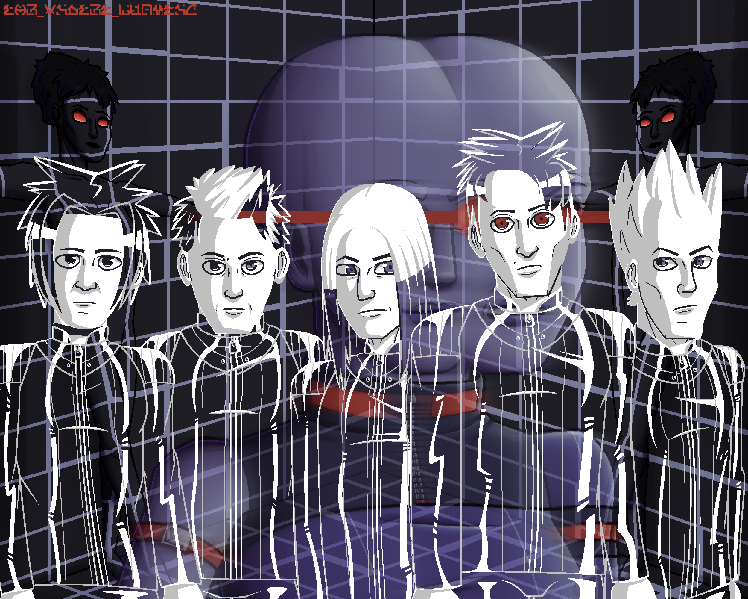 Hi this is my incredibly late anniversary art for Vapor Transmission!! Love this album so much I had to draw something based off the album art/cover. The purple alien lady in the back is based off the cover and ig she's a new oc now?? I have a design in here in these slides lol [no name yet]